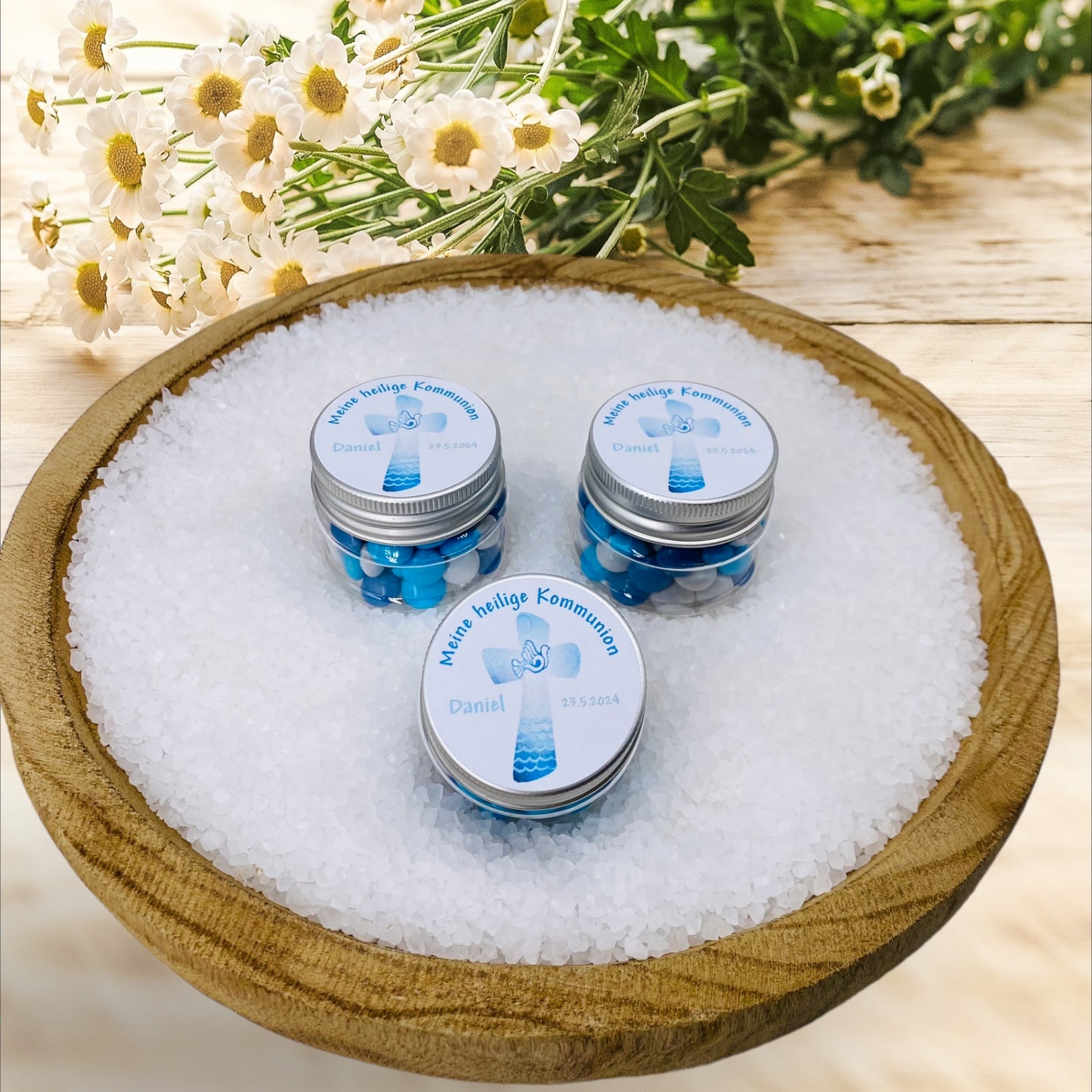 3. **Festfavoritter med et personligt præg:** Det trykte låg kan designes individuelt. "Mit hellige nadver" tilpasser sig fleksibelt til din dåb, nadver eller fødselsdag - gæstegaver med et personligt præg.