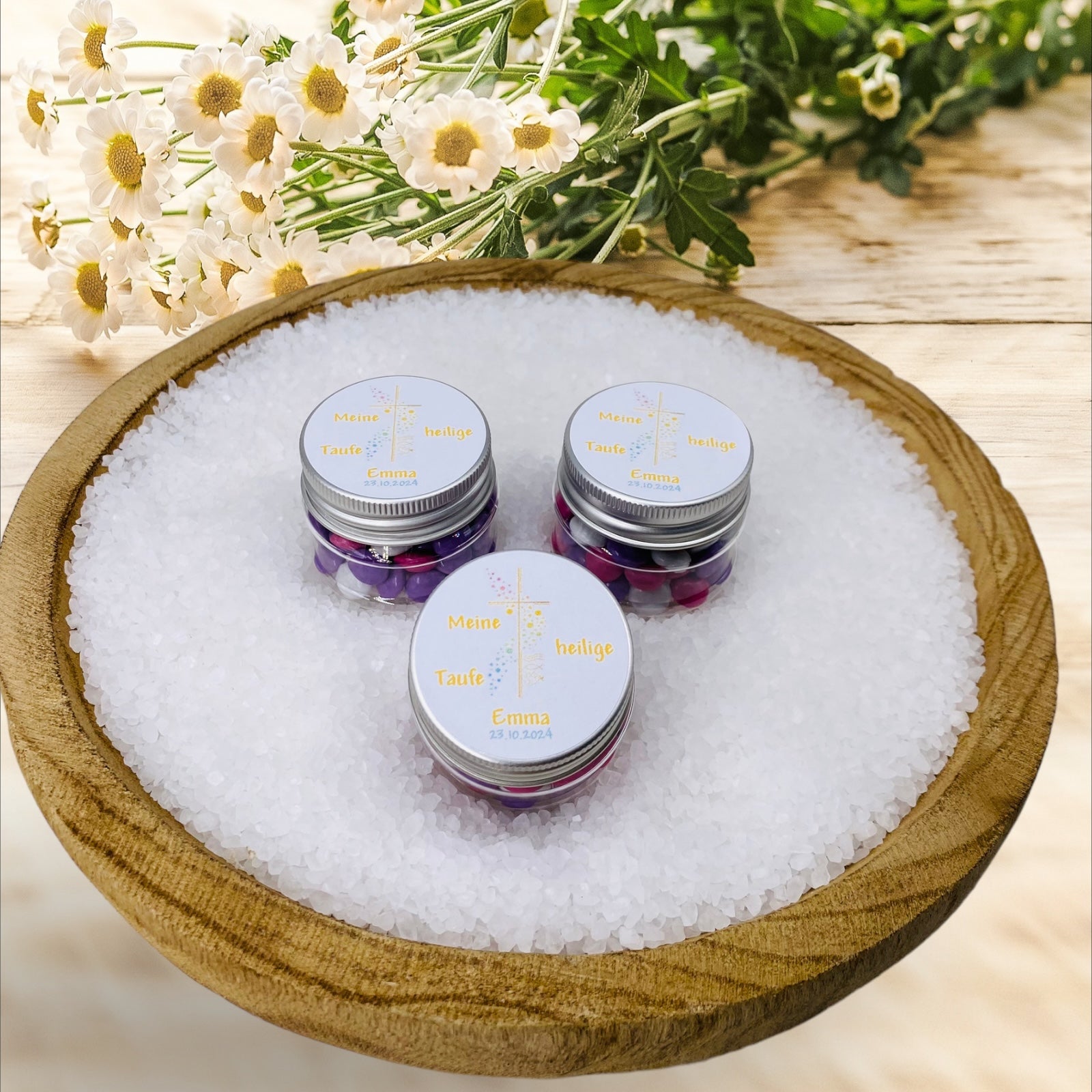 Velkommen til en verden af ​​søde overraskelser! Vores festgaver, i form af små krukker, er perfekte til særlige lejligheder som hellig nadver, dåb, konfirmation eller fødselsdag. Til de små damer præsenterer vi delikate sødmælkschokoladeknapper i pink, lilla og hvid, mens de små mænd kan se frem til de forfriskende farver blå, hvid og turkis.