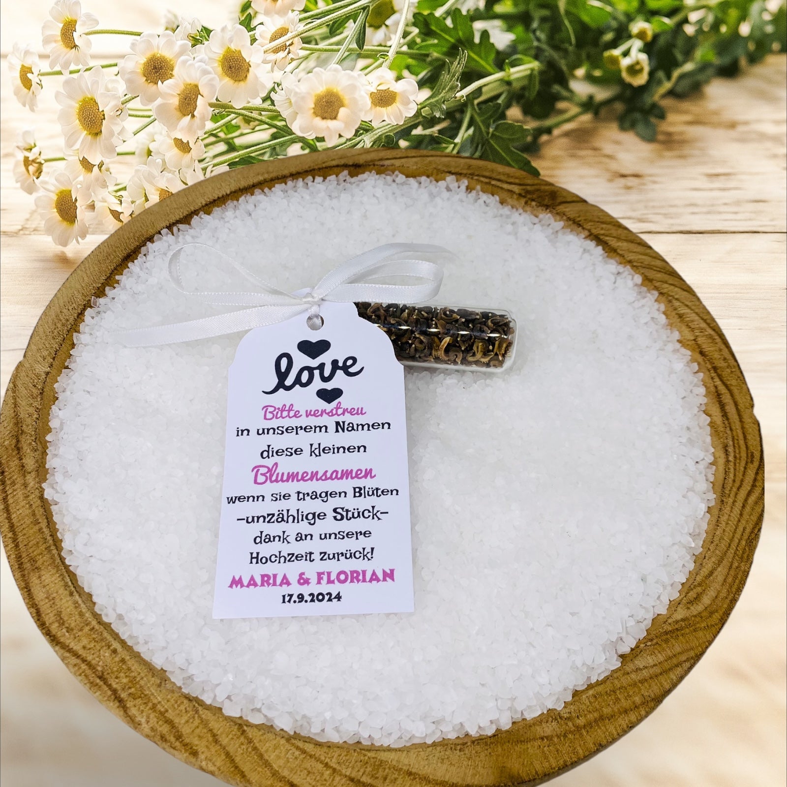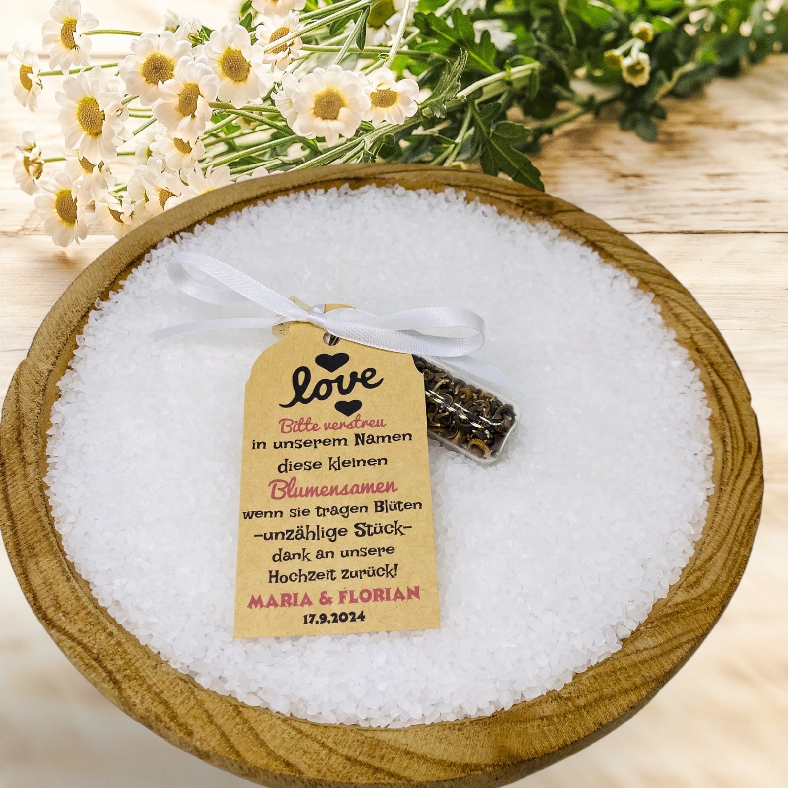 - **Generøst formet vedhæng:** Et smukt formet vedhæng pryder båndet og bærer den meningsfulde inskription: "Venligst spred disse små blomsterfrø i vores navn - når de bærer blomster, utallige stykker, så tænk tilbage på for eksempel vores bryllup , min fødselsdag.