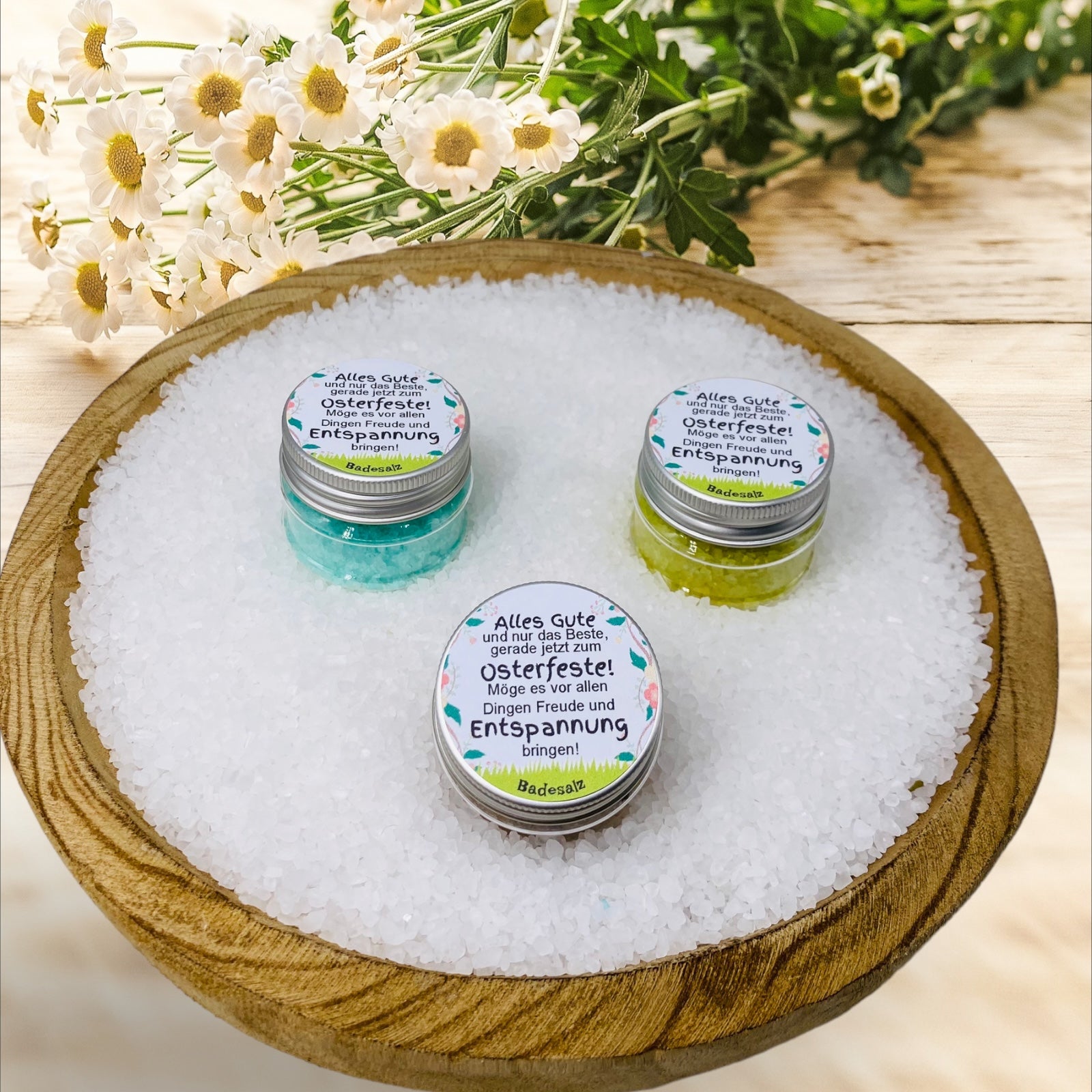 Döschen als Ostergeschenk gefüllt mit verschiedenen Badesalzen