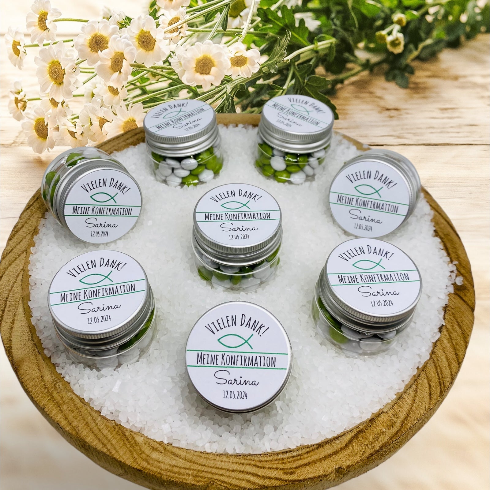 - **Kirchliche Symbole als liebevolle Grafik**: Ein Fisch, zieren das Döschen und verleihen dem kleinen Geschenk eine tiefe spirituelle Bedeutung.