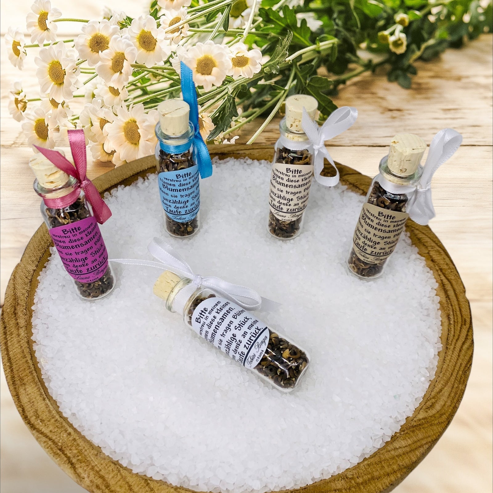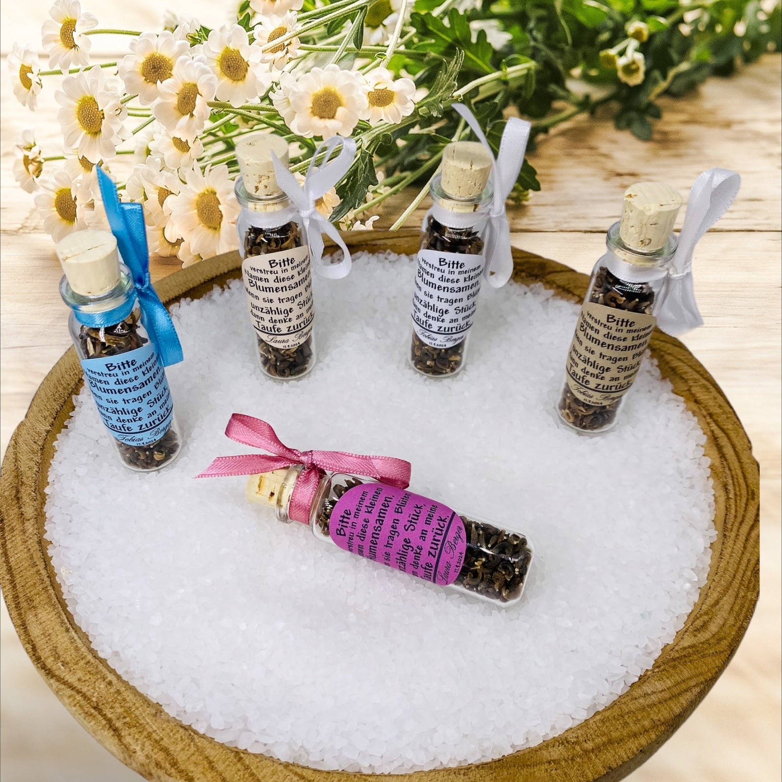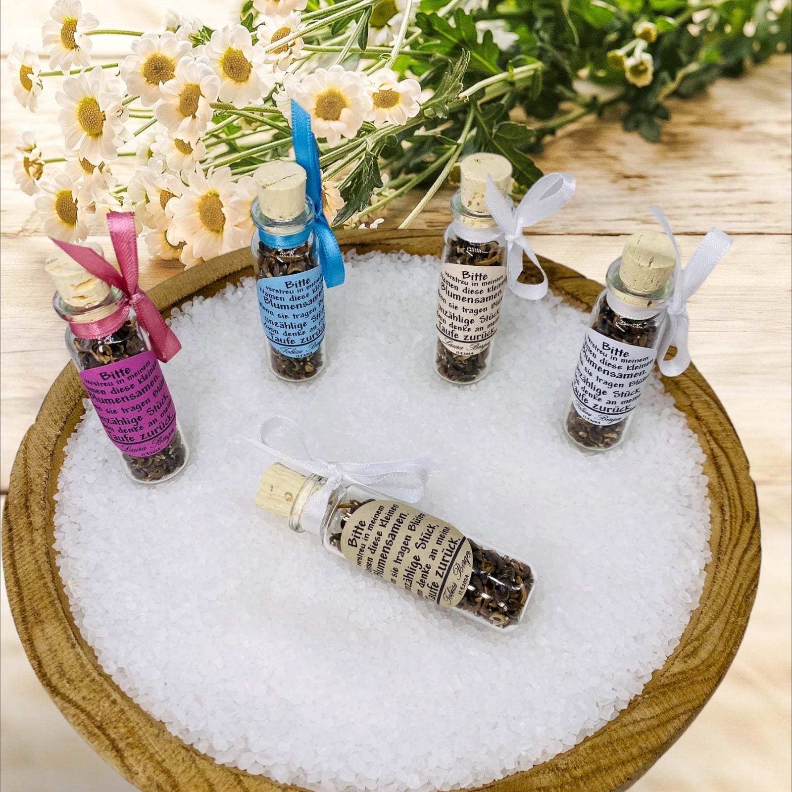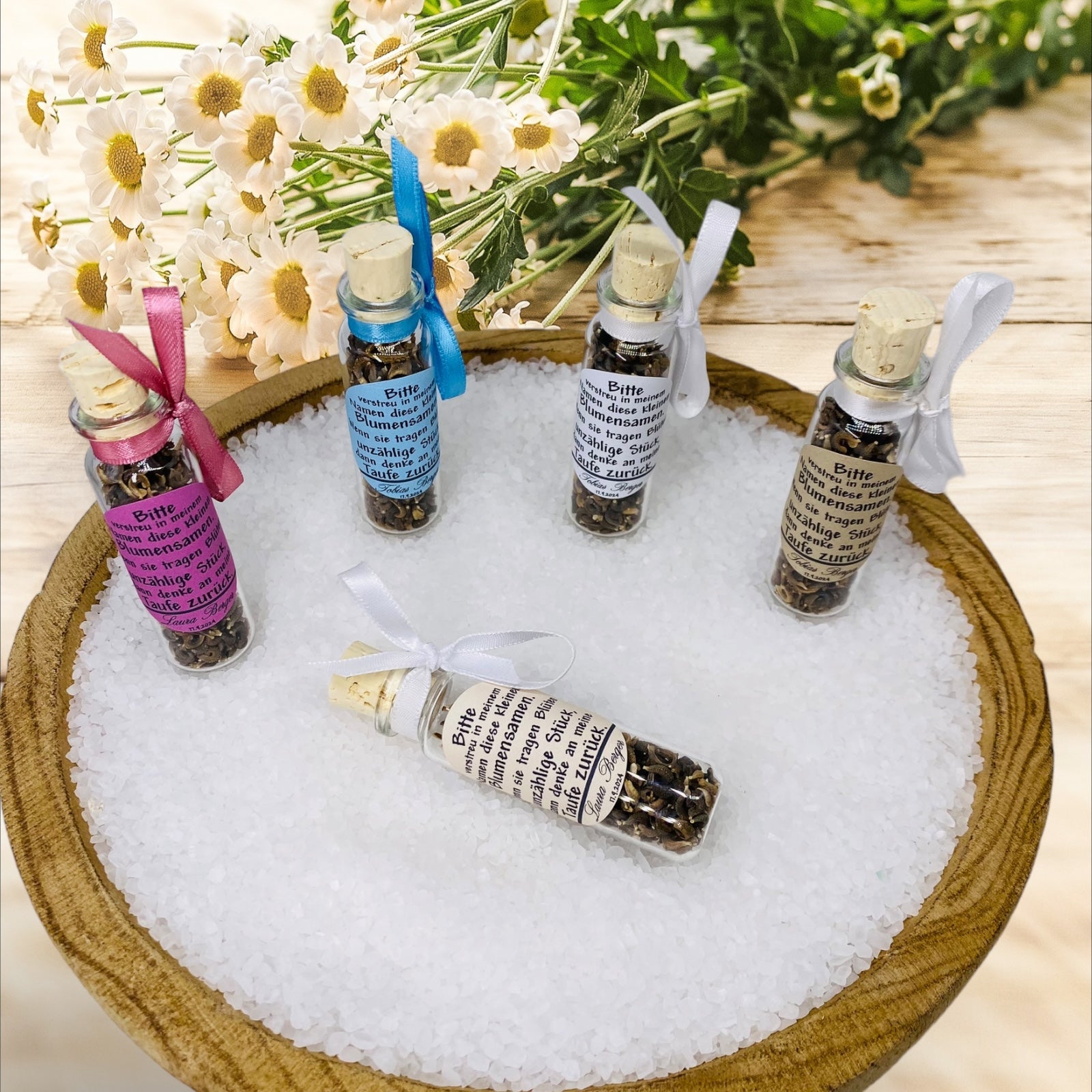 Verblühe deine Feier mit einem einzigartigen Gastgeschenk, das die Schönheit der Natur in sich trägt. Unser exklusives Gastgeschenk umfasst ein Schiffsglas (76 × 23 mm), gefüllt mit sorgfältig ausgewählten Blumensamen, und wird durch eine stilvolle Dekoration veredelt: