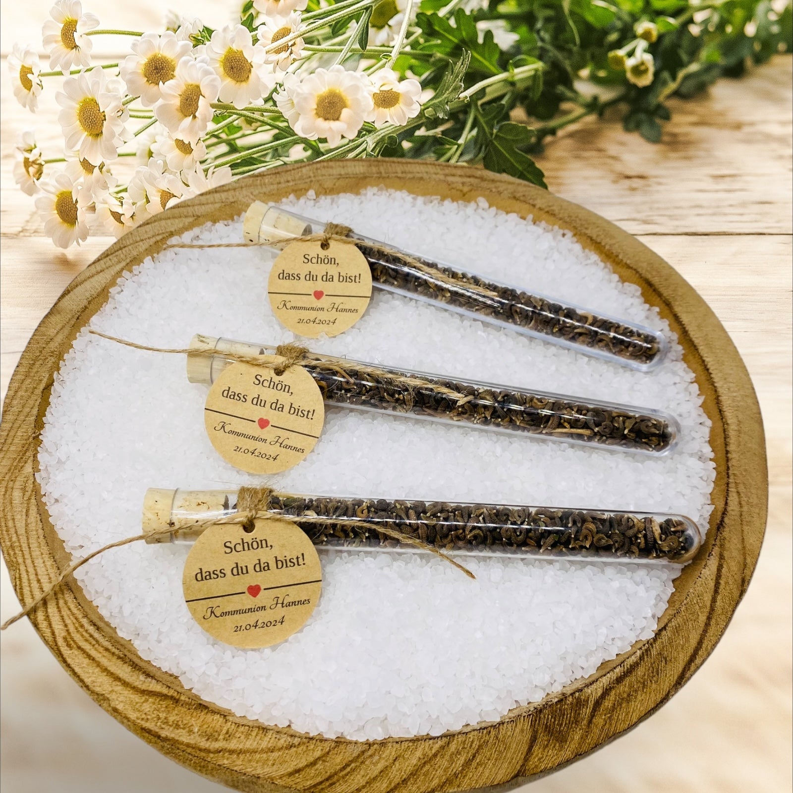 - **Persönlicher Anhänger:** Ein Anhänger aus Kraft Papier mit einem Durchmesser von 40 mm ziert das Reagenzglas. Darauf steht: "Schön, dass du da bist!" – festlich bedruckt mit einem roten Herz.