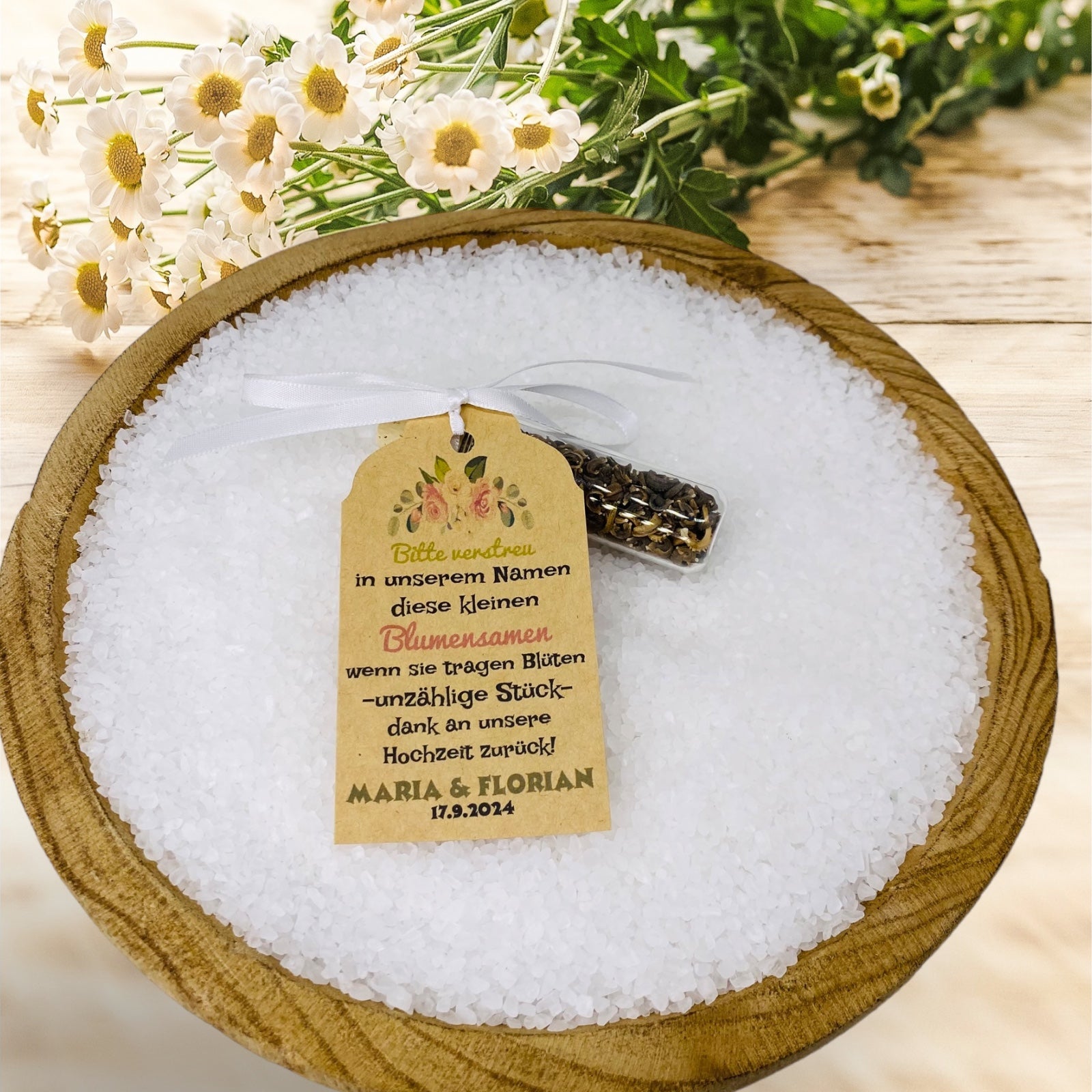 - **Großzügig geformter Anhänger:** Ein individuell geformter Anhänger schmückt das Band und trägt die bedeutungsvolle Inschrift: "Bitte verstreue in meinem Namen diese kleinen Blumensamen, die, wenn sie tragen Blüten, unzählige Stück, denk an meine/n ++Anlass++ zurück"