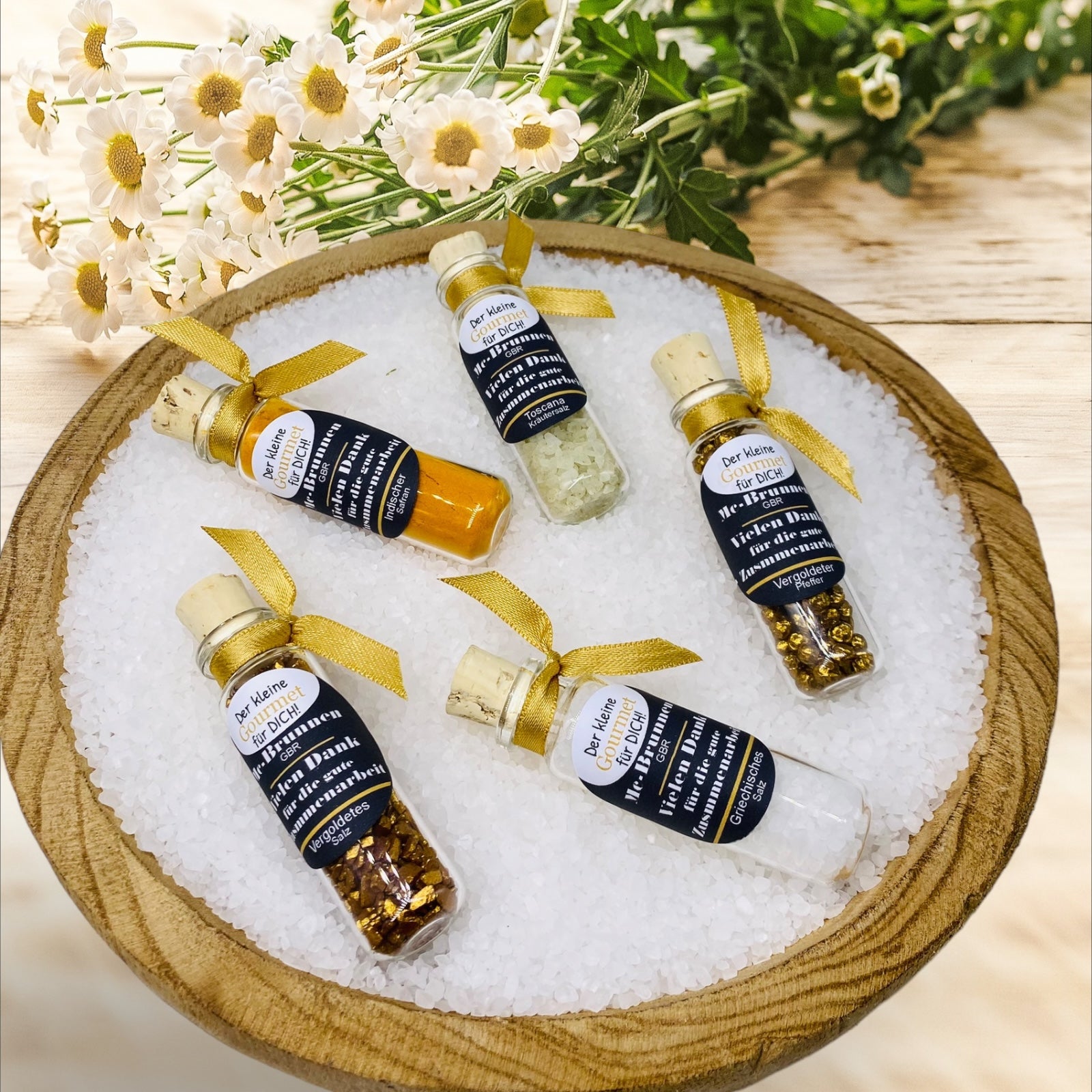 Tauchen Sie ein in ein exklusives Geschmackserlebnis mit unserem einzigartigen Werbegeschenk Kundengeschenk, Messegeschenk, Mitarbeitergeschenk, einem Schiffsgläschen (76 × 23 mm) gefüllt mit erlesenen Gourmet-Gewürzen. Von vergoldetem Pfeffer und Salz bis hin zu toskanischen Kräutern, griechischem Salz und indischem Safran – jede Mischung ist sorgfältig ausgewählt für höchsten Genuss.