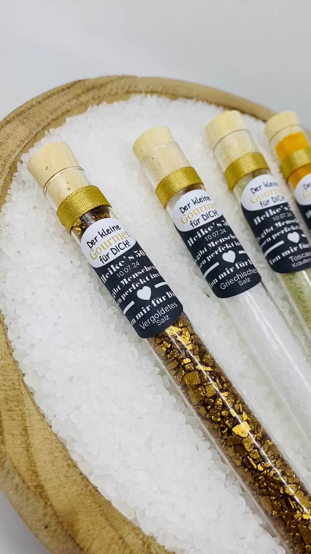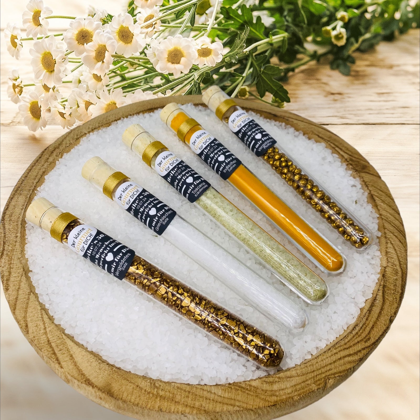 Feiere den kleinen Gourmet in deinem Leben mit unserem exquisiten Gastgeschenk zum Geburtstag! In einem edlen Reagenzglas (160 × 16 mm) verbirgt sich eine sorgfältig kuratierte Auswahl an Gourmet-Gewürzen – von vergoldetem Salz über vergoldeten Pfeffer bis hin zu indischem Safran, Toskana Kräutersalz und griechischem Salz.