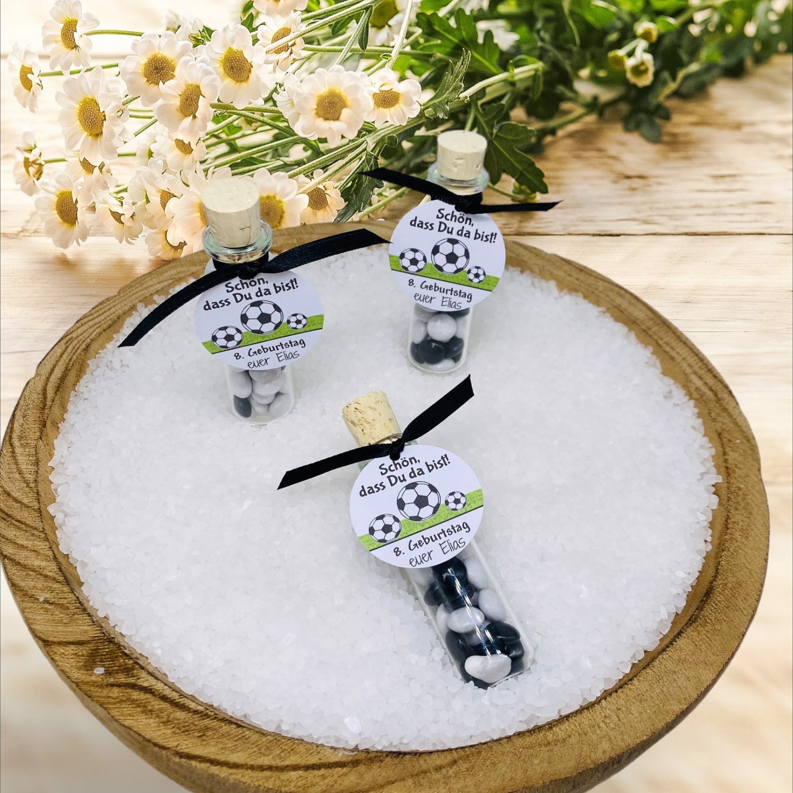 Im Fußballfieber: Personalisiertes Schiffsgläschen Gastgeschenk für den ultimativen Kindergeburtstag mit dem Motto Fussball