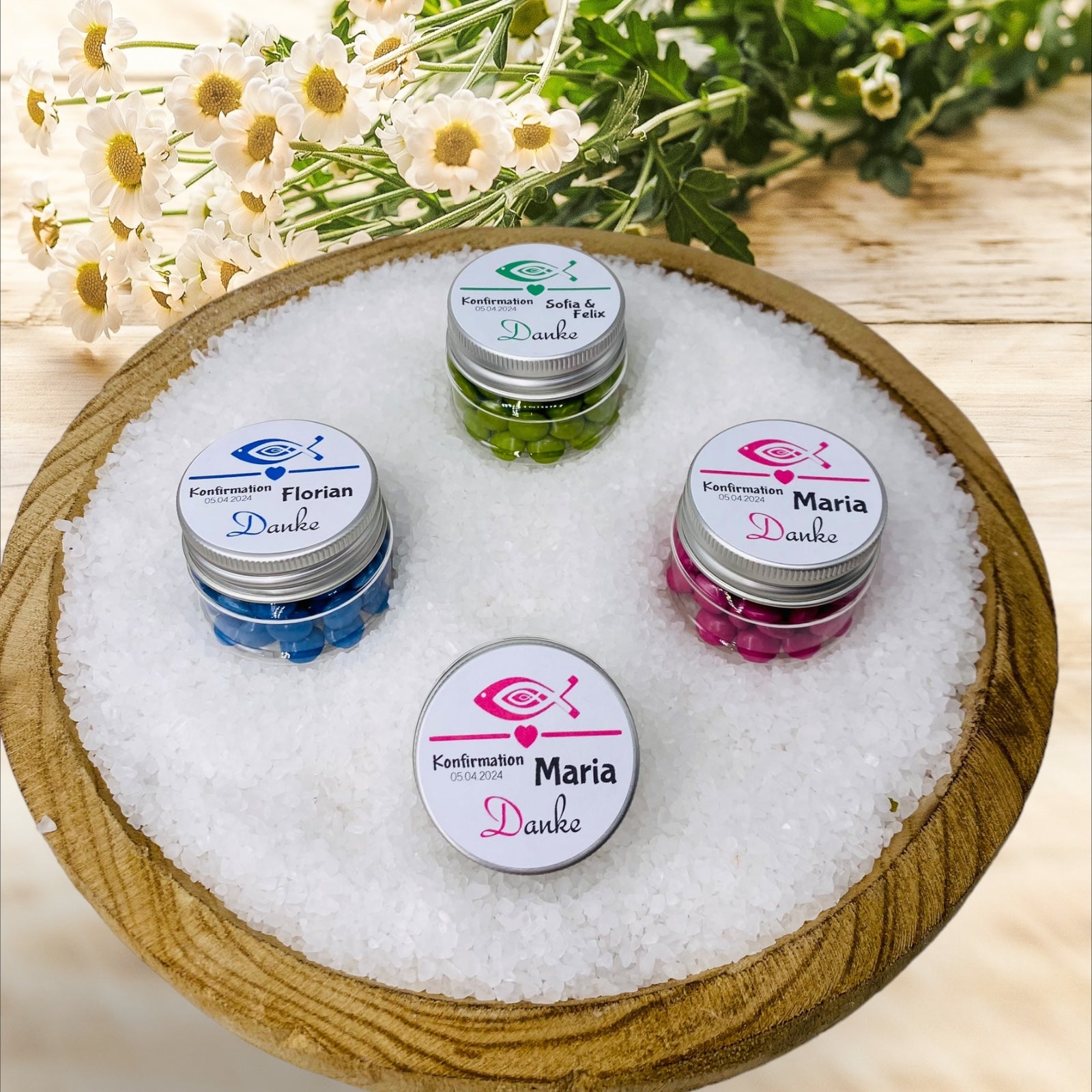 Präsentieren Sie Ihren Gästen ein einzigartiges und liebevoll gestaltetes Gastgeschenk für besondere Anlässe wie Kommunion, Konfirmation oder Taufe, Unser exklusiver Tiegel, aus Kunststoff, begeistert mit einer Füllung aus farblich abgestimmten Schokolinsen oder einer von 45 anderen verlockenden Optionen. Mit den Maßen 43 mm x 38 mm setzt es stilvolle Akzente als Tischdeko oder bezauberndes Giveaway.