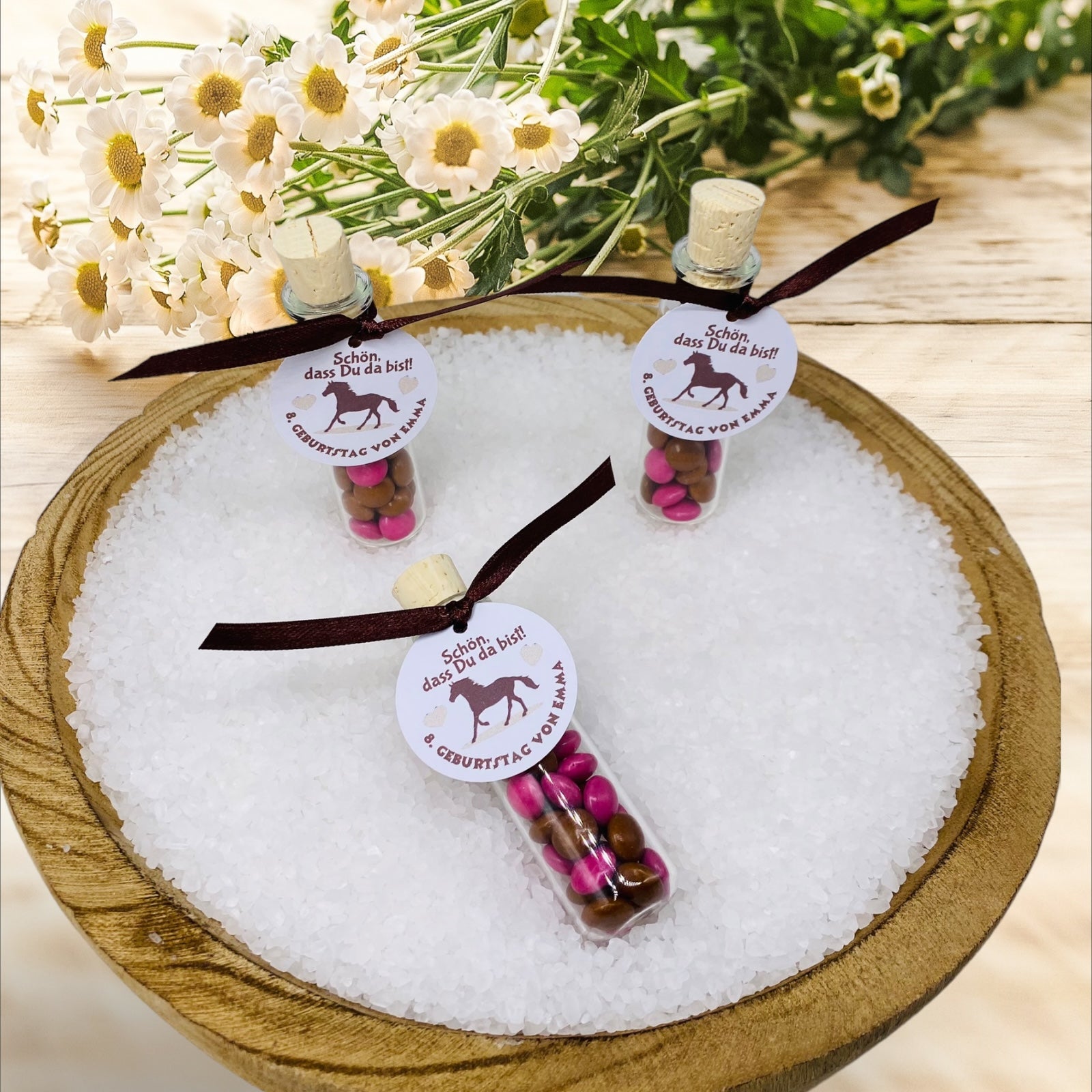 Magisches Gastgeschenk für den Pferde-Kindergeburtstag: Personalisiertes Schiffsgläschen gefüllt mit farblich abgestimmten Schokolinsen