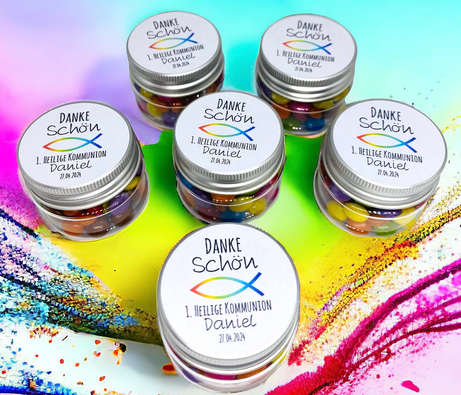 Entdecken Sie unser exquisites Gastgeschenk für besondere Anlässe - einen hübschen Tiegel gefüllt mit belgischen bunten Schokolinsen! Der Tiegel ist mit einem herzlichen Dankeschön und einem Symbol, einem Fisch in Regenbogenfarben, beschriftet. Ein perfektes Souvenir für die erste heilige Kommunion von Beispiel: Daniel am 27.4.2024, hier drucken wir natürlich ihren Namen und Datum. Mit 45 verschiedenen Inhalten zur Auswahl ist dieses Gastgeschenk nicht nur ideal für Kommunionen, sondern auch für Taufen, Konfirmationen und jede andere besondere Feier. Machen Sie Ihren besonderen Tag noch unvergesslicher mit unseren individuell gestalteten Schokolinsen-Tiegeln!
