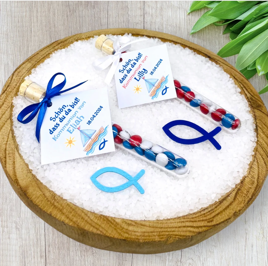 Entdecke unsere bezaubernden Gastgeschenke für Taufe, Kommunion oder Konfirmation – handgefertigte Reagenzgläser mit einem entzückenden Anhänger, auf dem ein gemaltes Segelschiff stolz in der Sonne glänzt, begleitet von einem christlichen Fischsymbol.