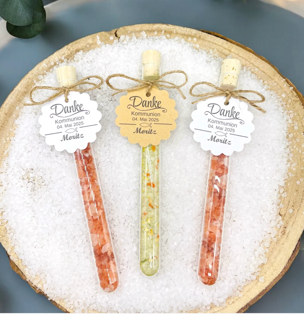 Personalisierte Gastgeschenke/ Dankeschön Geschenke zur Kommunion, Konfirmation oder Taufe – Edle Reagenzgläser mit individueller Füllung