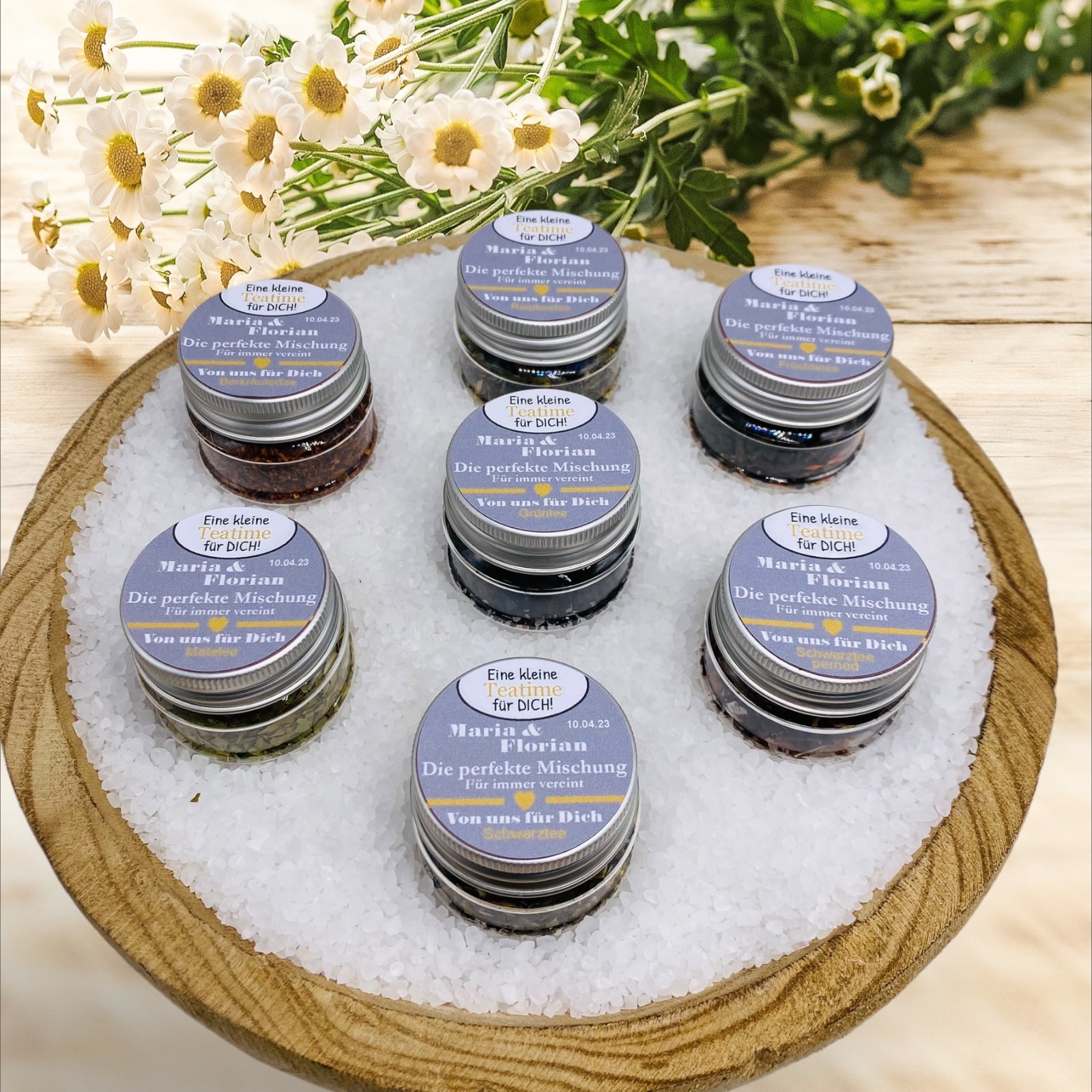 - Persönliche Note: Das Gastgeschenk kann mit einer individuellen Bedruckung personalisiert werden. "Eine kleine Tea time für dich", "Maria und Florian" mit dem Hochzeitsdatum, und die herzliche Botschaft "Die perfekte Mischung für immer vereint. Von uns für dich."