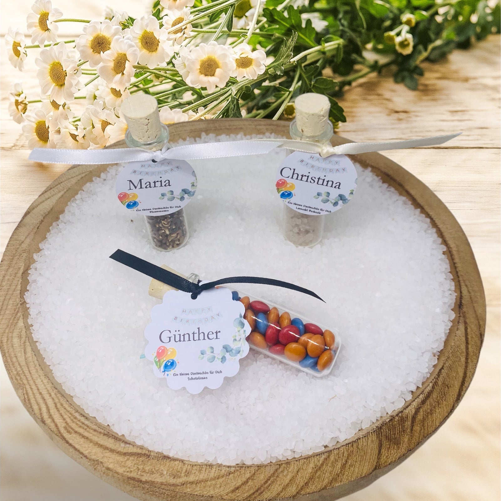 Please include the following in your shopping cart: filling, guest list. We can also print “Nice that you are here” instead of the guest name! Simply let us know in your shopping cart. If you have a file with the guest list, you can send it to service@kleingeschenke24.de after ordering and we will then assign it.