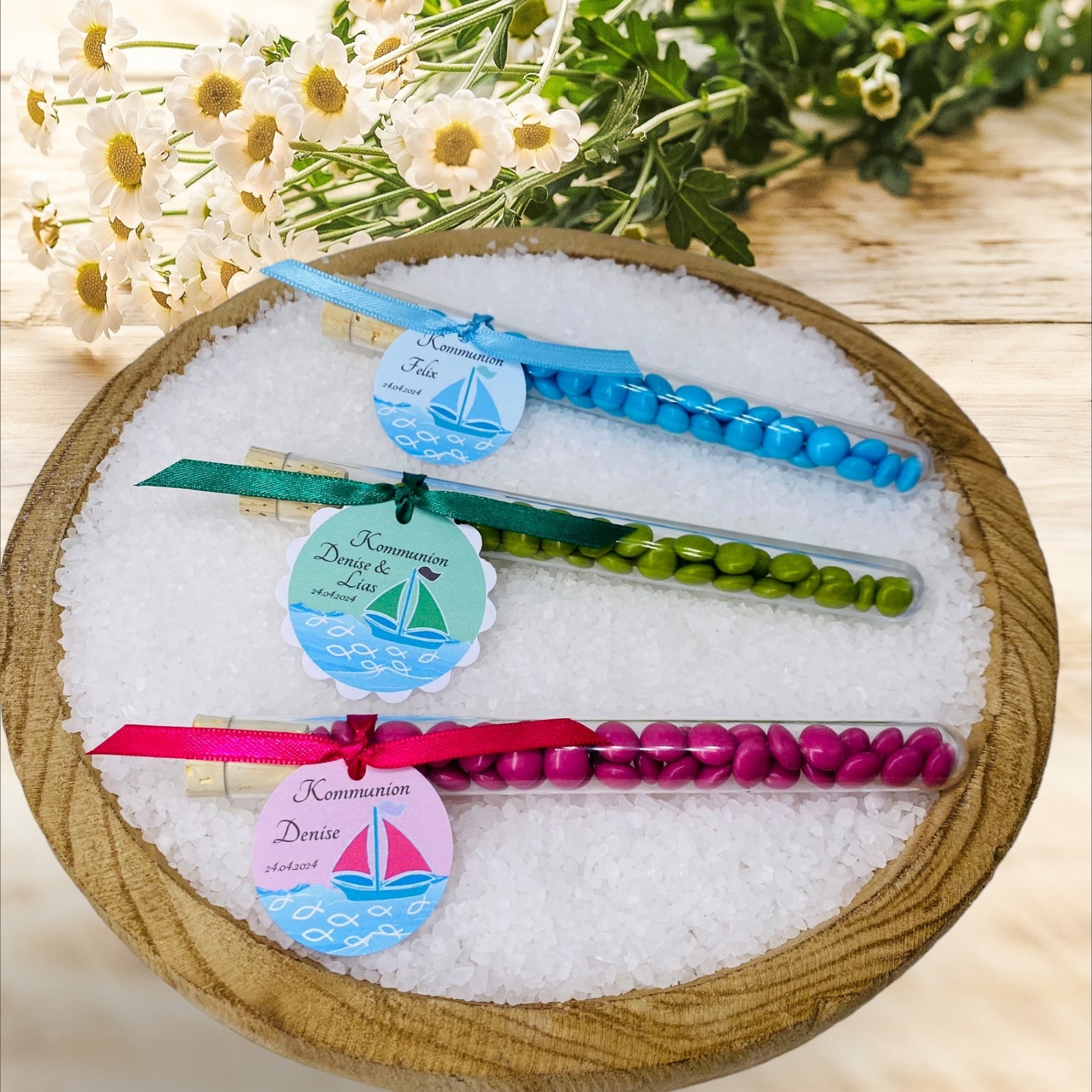 Das authentische Reagenzglas ist mit einem echten Korken verschlossen, was dem Geschenk eine natürliche Eleganz verleiht. Ein farblich abgestimmtes Satin Band umgibt das Reagenzglas, an dem ein 40 mm großer Anhänger befestigt ist. Dieser exquisite Anhänger zeigt ein Segelboot, umgeben von kirchlichen Fischen, und trägt die individuellen Details des Anlasses, sei es Kommunion, Konfirmation oder Taufe. Der Name und das Datum werden ebenfalls liebevoll auf dem Anhänger verewigt.
