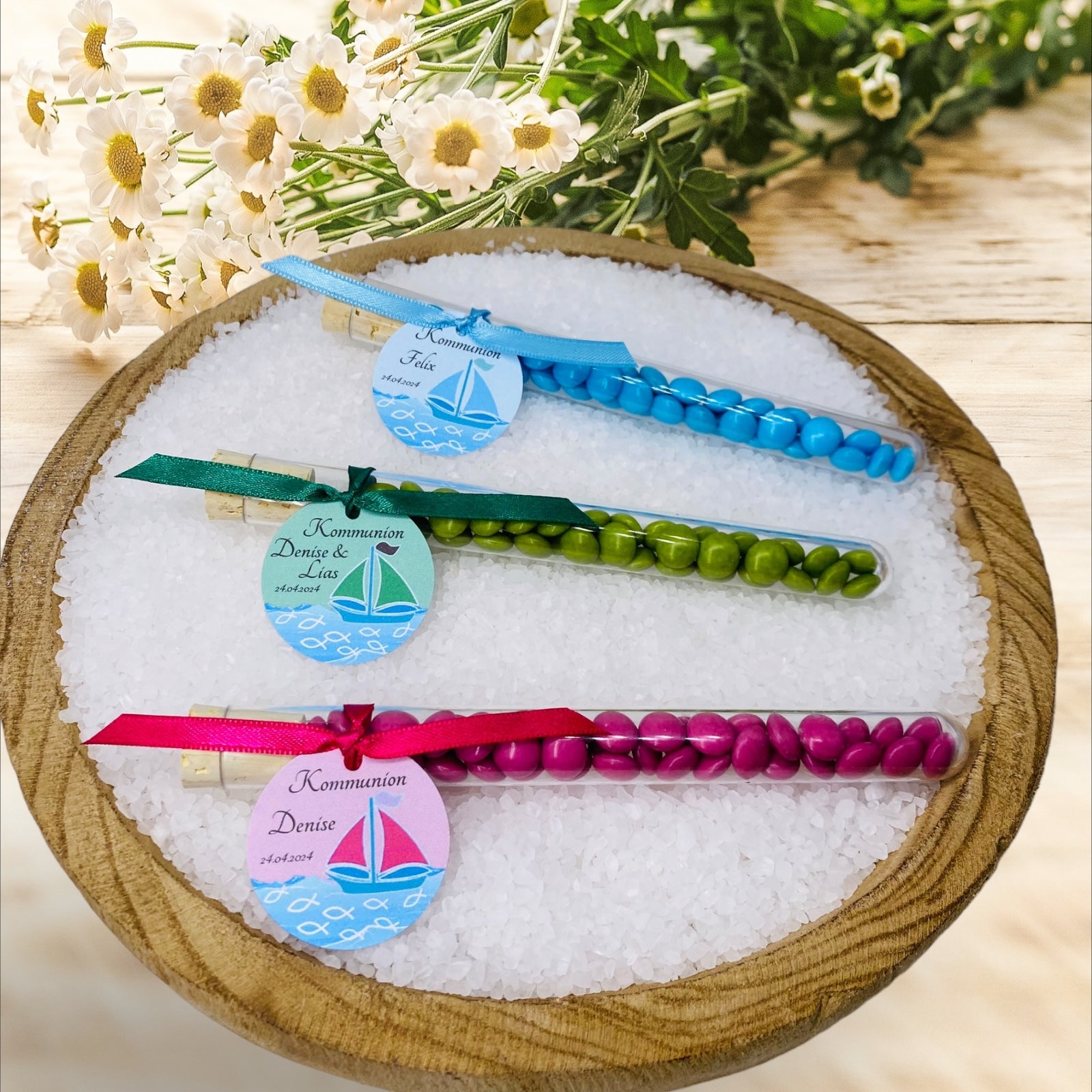 Präsentieren Sie mit unserem exklusiven Gastgeschenk in Form eines Reagenzglases ein einzigartiges Erlebnis für besondere Anlässe wie Kommunion, Konfirmation oder Taufe. Das Reagenzglas, mit einer Größe von 160 × 16 mm, ist nicht nur ein Blickfang, sondern auch gefüllt mit freudig bunten Schokolinsen, die sorgfältig in Einzelfarben farblich abgestimmt sind.