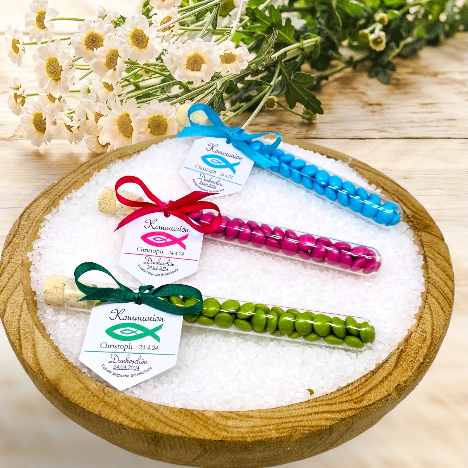- **Symbolischer Fischdruck**: Ein kunstvoll gestalteter kirchlicher Fisch in Türkis, Pink oder Grün – passend zu den Schokolinsen – verleiht dem Geschenk eine spirituelle Note.