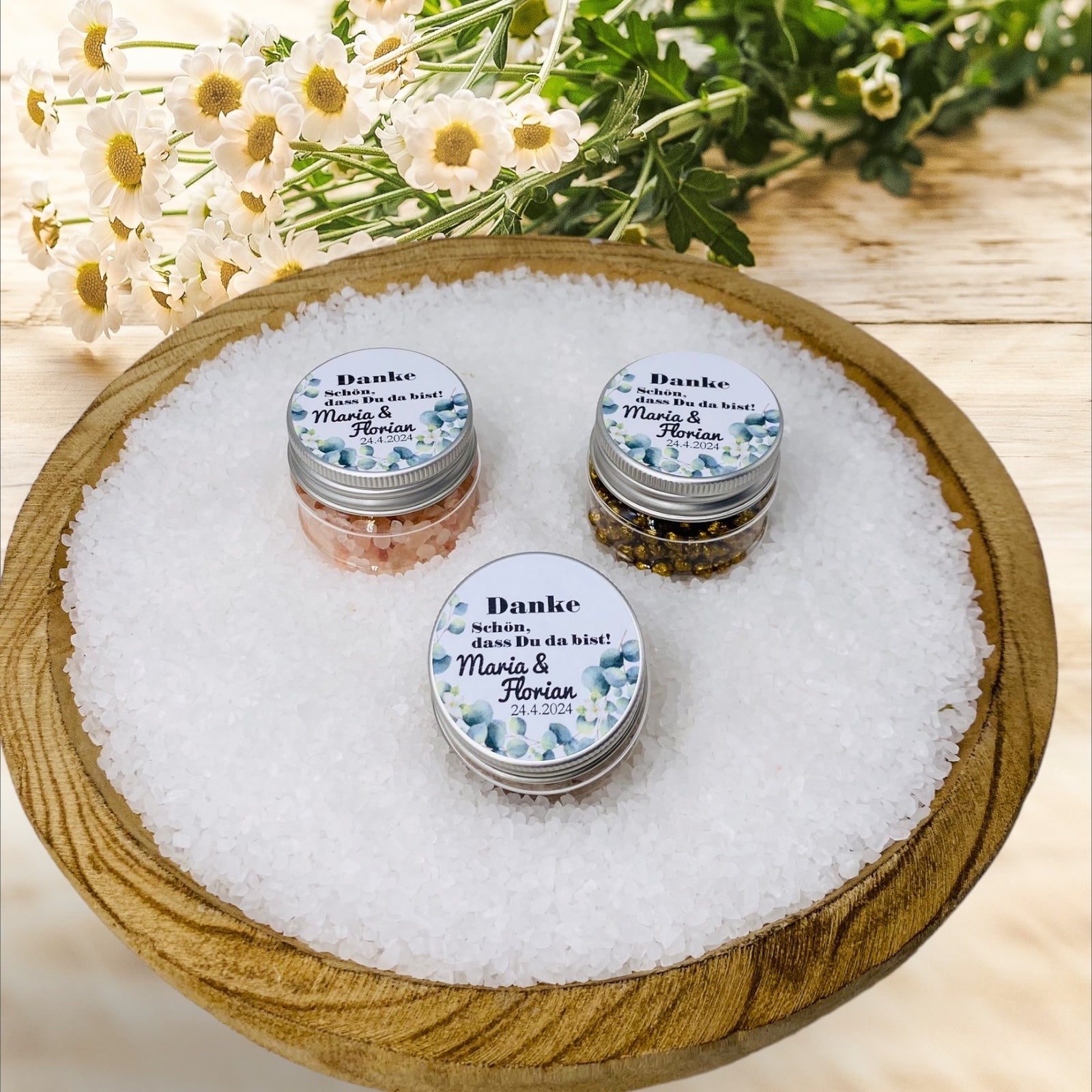 Entdecken Sie unser exklusives Hochzeits-Gastgeschenk – ein einzigartiger Tiegel (43 mm x 38 mm), gefüllt mit einer Auswahl von 45 verschiedenen Inhalten: