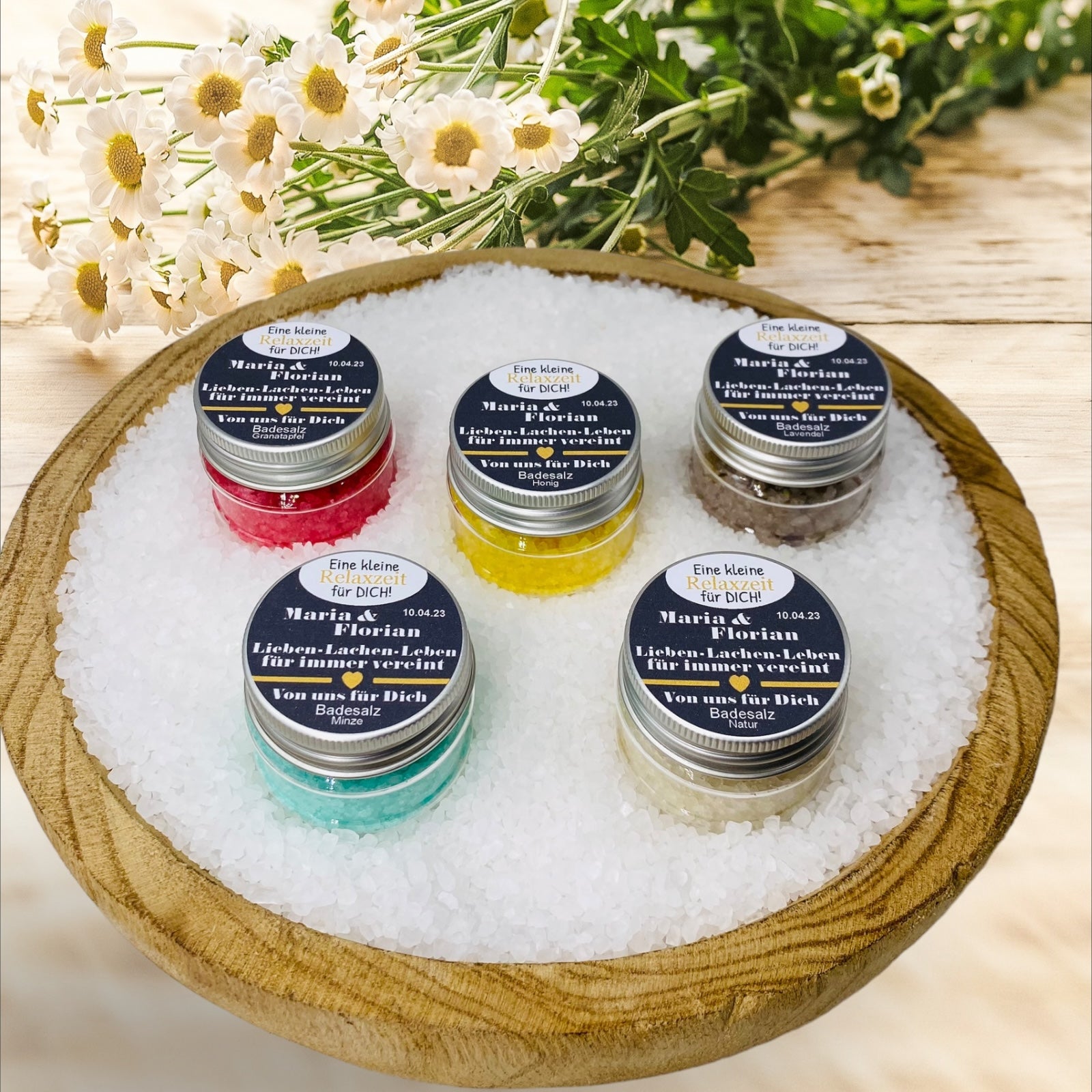 ✨ Liebevoll gestaltet: Ein elegantes Döschen, 43 × 38 mm groß, gefüllt mit einem von fünf verführerischen Badesalzen – Minze, Granatapfel, Lavendel, Naturbadesalz oder Honigmandel. Ein einzigartiges Präsent, das eure Liebe und den besonderen Tag unterstreicht.
