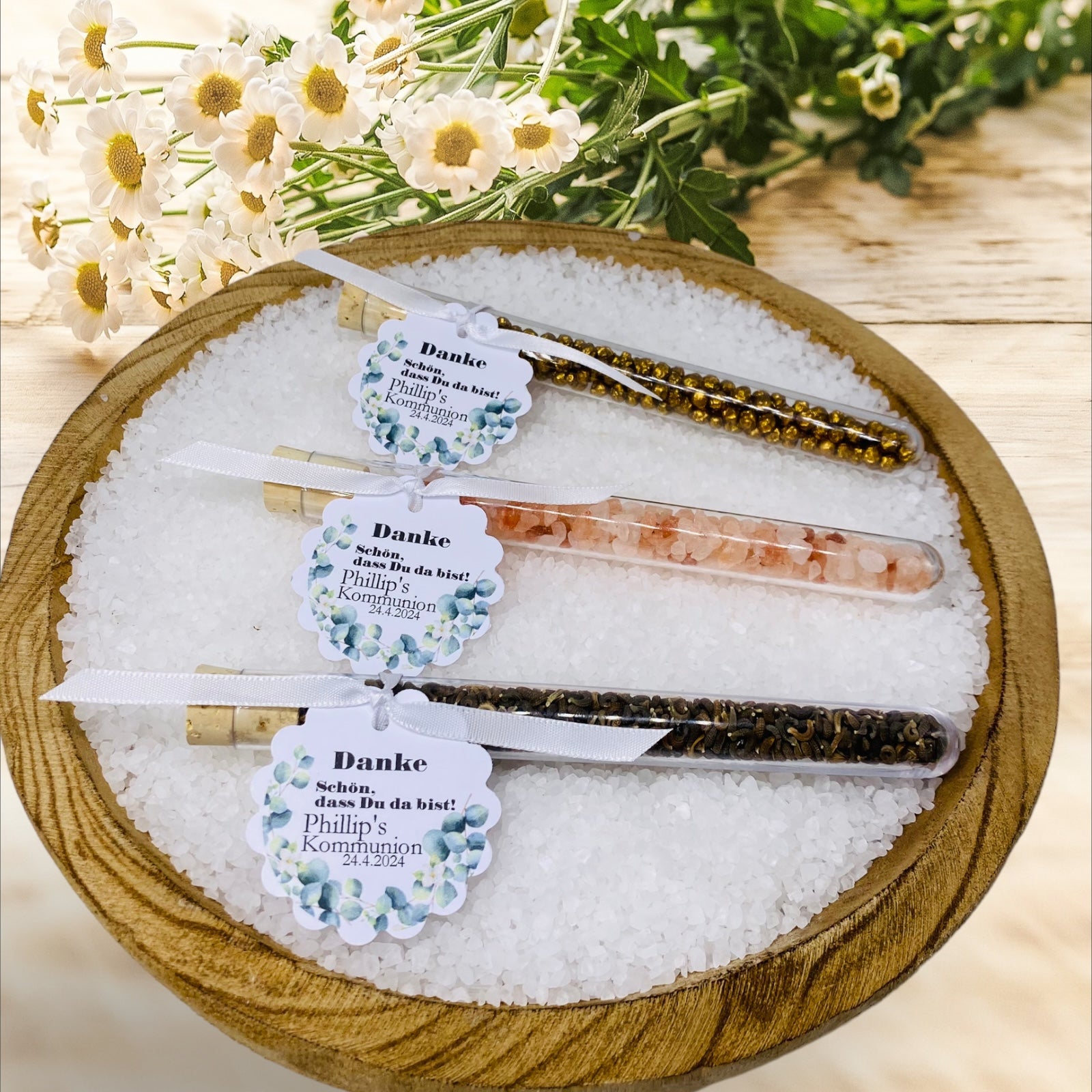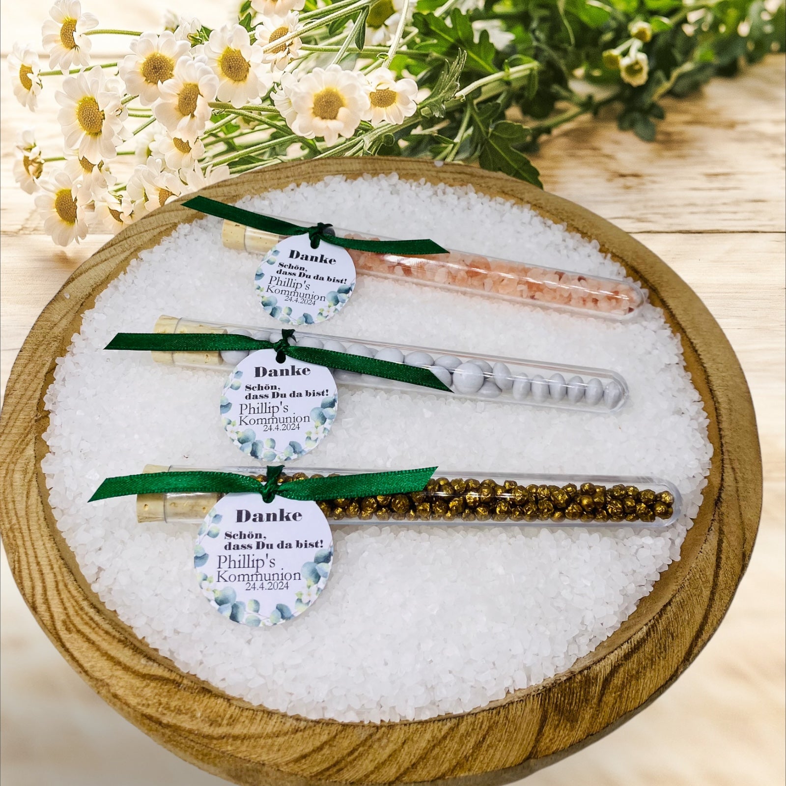Entdecken Sie unsere liebevollen Gastgeschenke für besondere Anlässe wie Kommunion, Konfirmation oder Taufe – elegante Reagenzgläser (160 × 16 mm), verschlossen mit einem echten Korken und dekoriert mit einem Satinband in einer von zehn verschiedenen Farben.