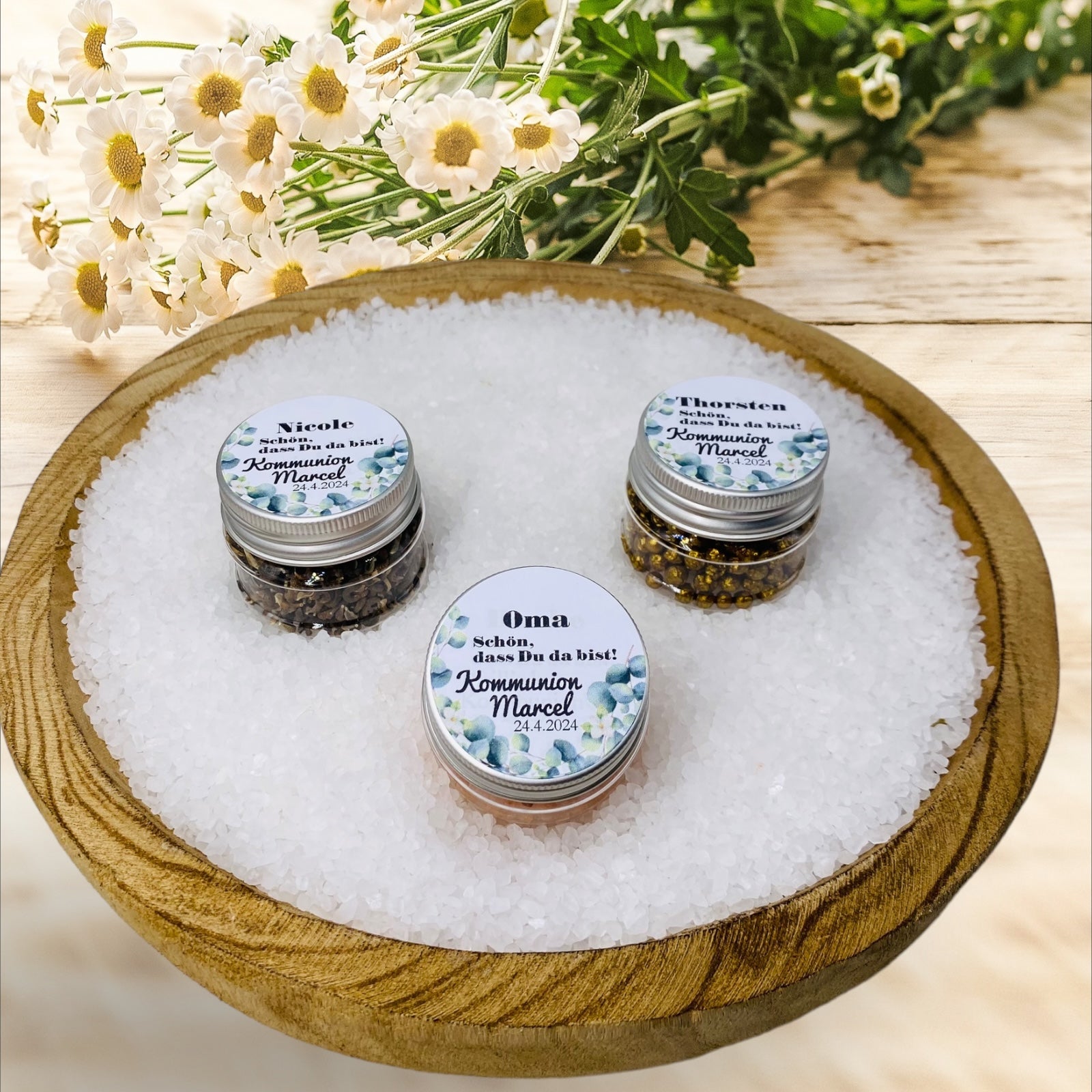 Entdecken Sie unser exquisites Gastgeschenk für Ihre Kommunion, Konfirmation und Taufe – ein charmanter Tiegel (43 × 38 mm), kunstvoll verschlossen mit einem Aluminiumdeckel. Gefüllt mit einer Auswahl aus 45 verschiedenen Inhalten: