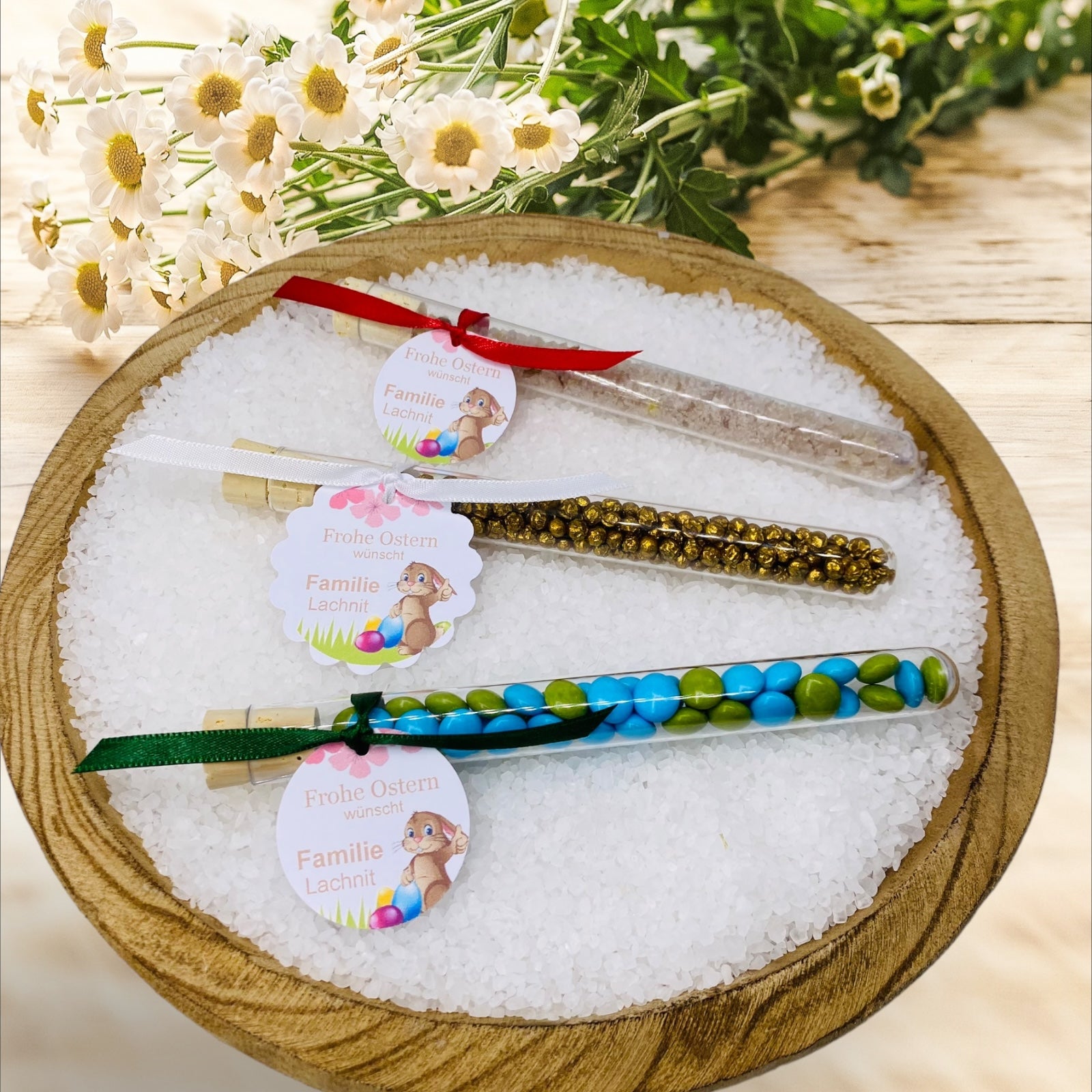 Reagenzglas als Ostergeschenk gefüllt mit verschiedenen Inhalte und Grafik