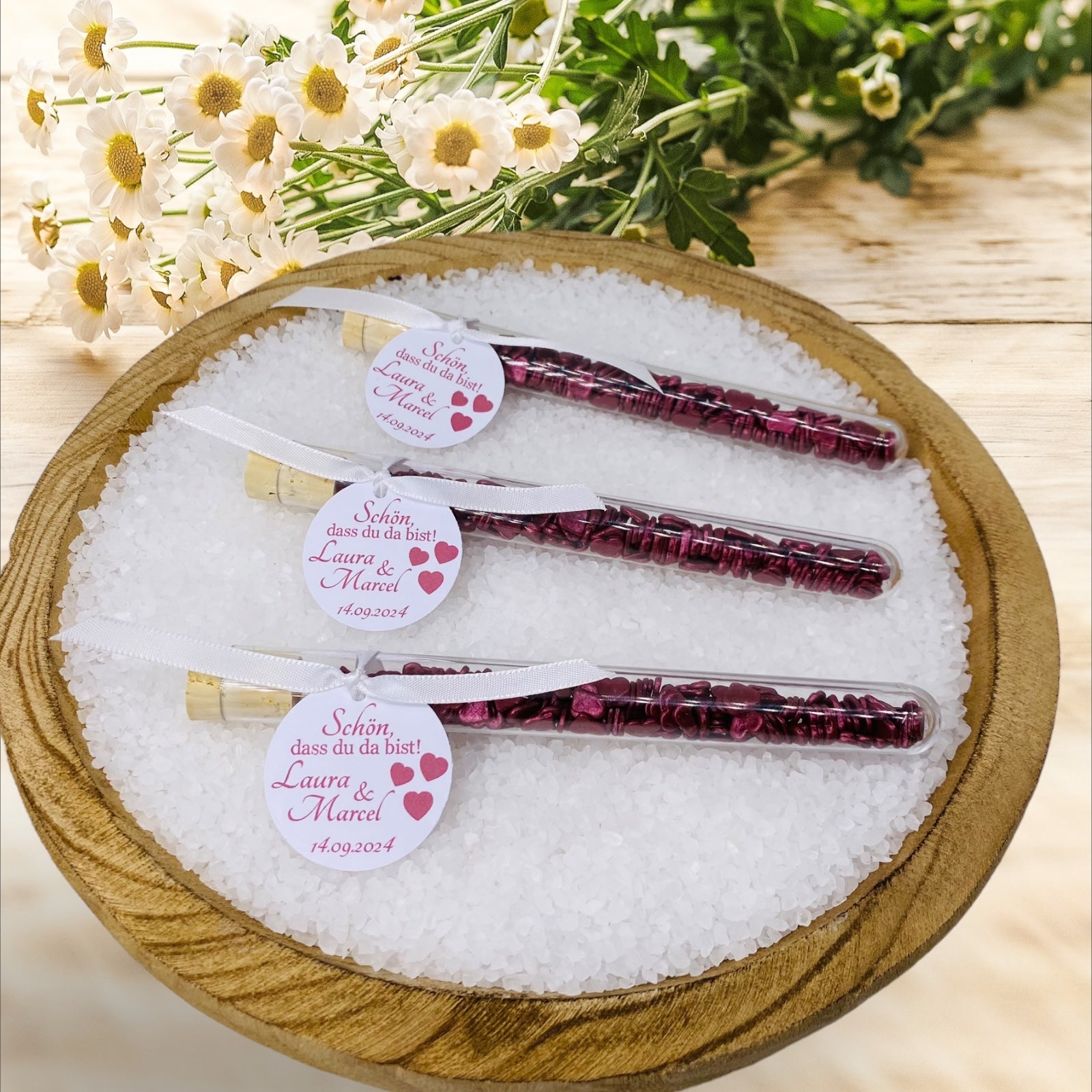 The pendant is decorated with hearts in Bordeaux, personalized with the heartfelt saying "It's nice that you're there", the name of the bride and groom and the unforgettable wedding date. A loving detail that gives every guest a special touch.