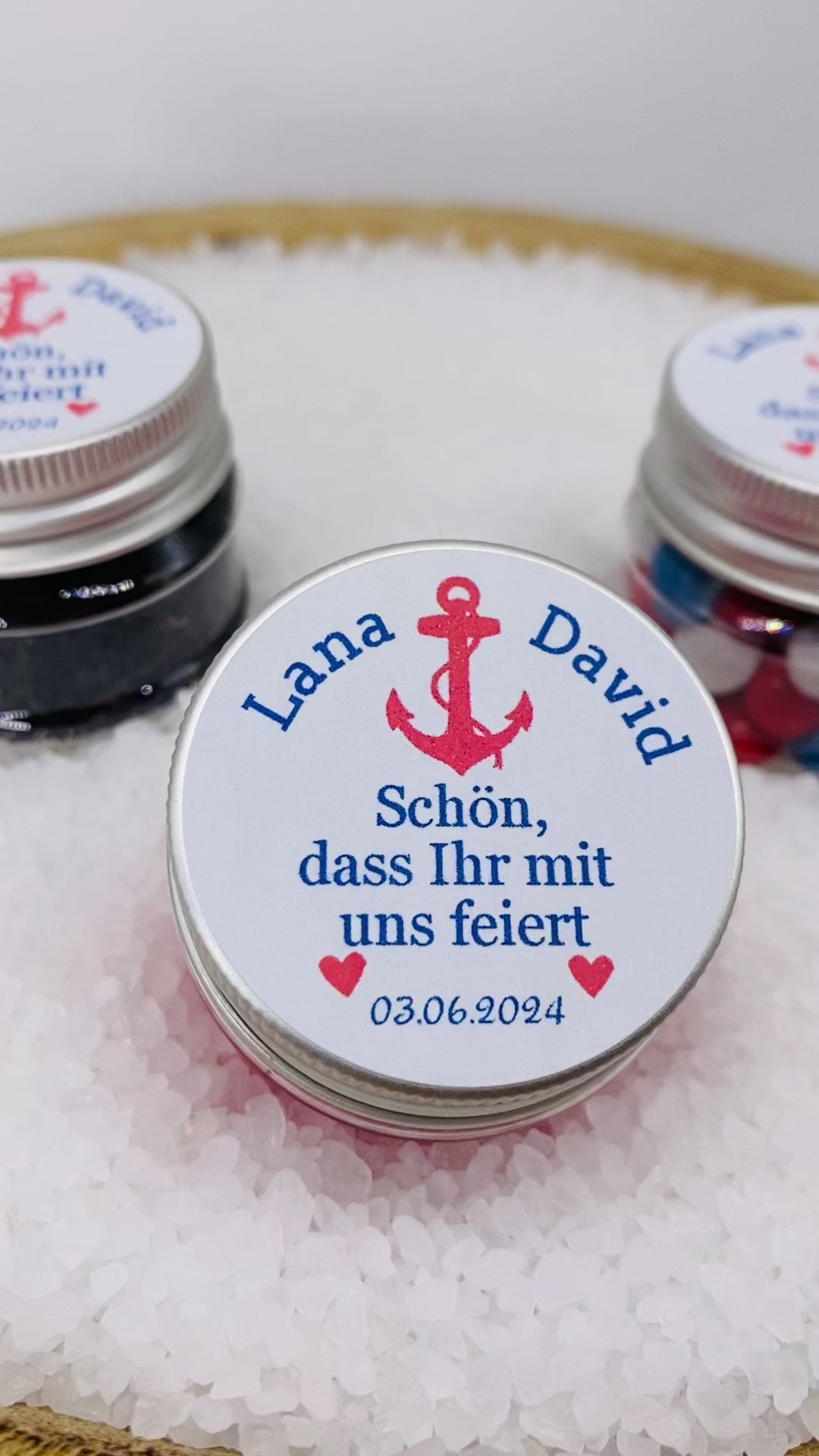 The lid is adorned with a stylish red anchor, which not only represents love, but also stability and happiness. This will be personalized with the name of the bride and groom and the heartfelt message: “It’s nice that you’re celebrating with us.”