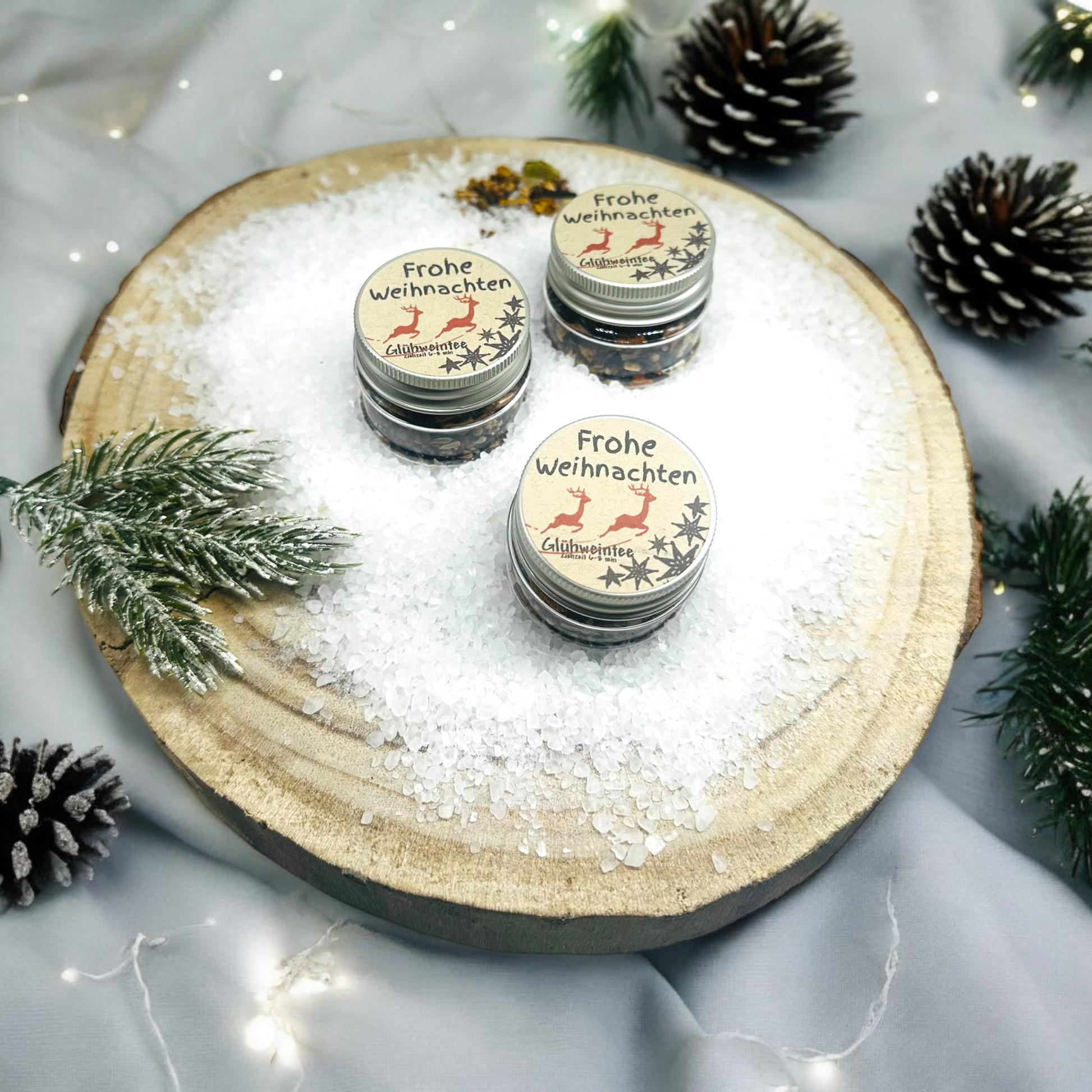 Verschenken Sie in diesem Jahr etwas ganz Besonderes: Ein Döschen, gefüllt mit erlesenem Glühweintee, der den Duft und Geschmack von Weihnachten einfängt! Bedruckt mit festlichen Motiven und einer herzlichen „Frohe Weihnachten“-Botschaft, eignet sich dieses elegante Gastgeschenk perfekt für Familie, Freunde, Kollegen und Geschäftspartner.